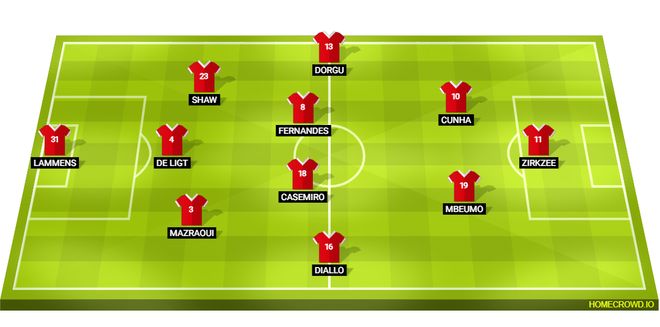 曼联首发11人预测: 拉门斯;马兹拉维,德利赫特,卢克肖;阿马德,卡塞米罗,布鲁诺·费尔南德斯,多尔古;姆贝乌莫,库尼亚;齐尔克泽